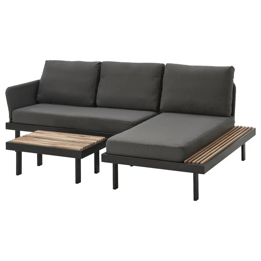 ИКЕА IKEA Расслабьтесь и проведите время со своими гостями в этом удобном наборе для отдыха. Он состоит из двухместного дивана, журнального столика и шезлонга со встроенным приставным столиком, куда можно положить нужные вам вещи. Оригинальная икея/ikea
