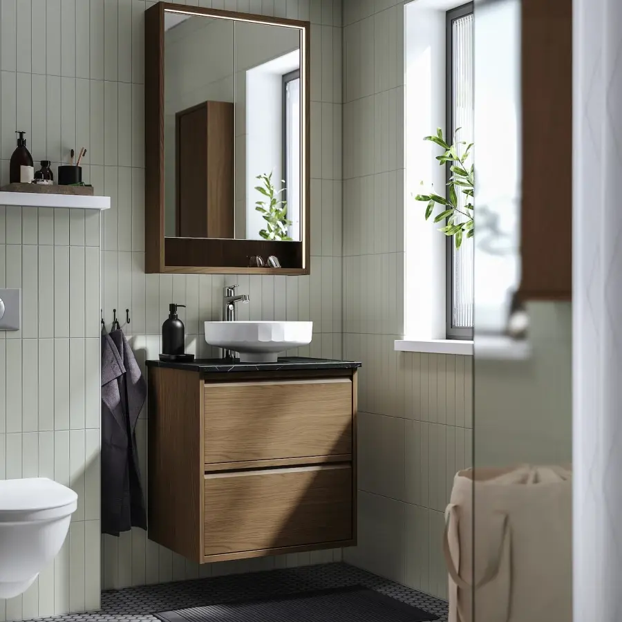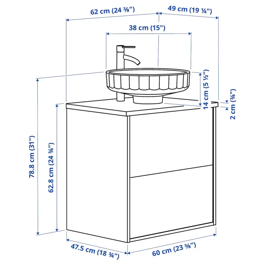 ИКЕА IKEA Мебель для ванной комнаты ÄNGSJÖN восхищает современным внешним видом и минималистскими деталями. Шкафчик под умывальник в сочетании со столешницей и круглым умывальником на столешнице создает стильный элемент с уникальным характером в ванной комнате. Оригинальная икея/ikea