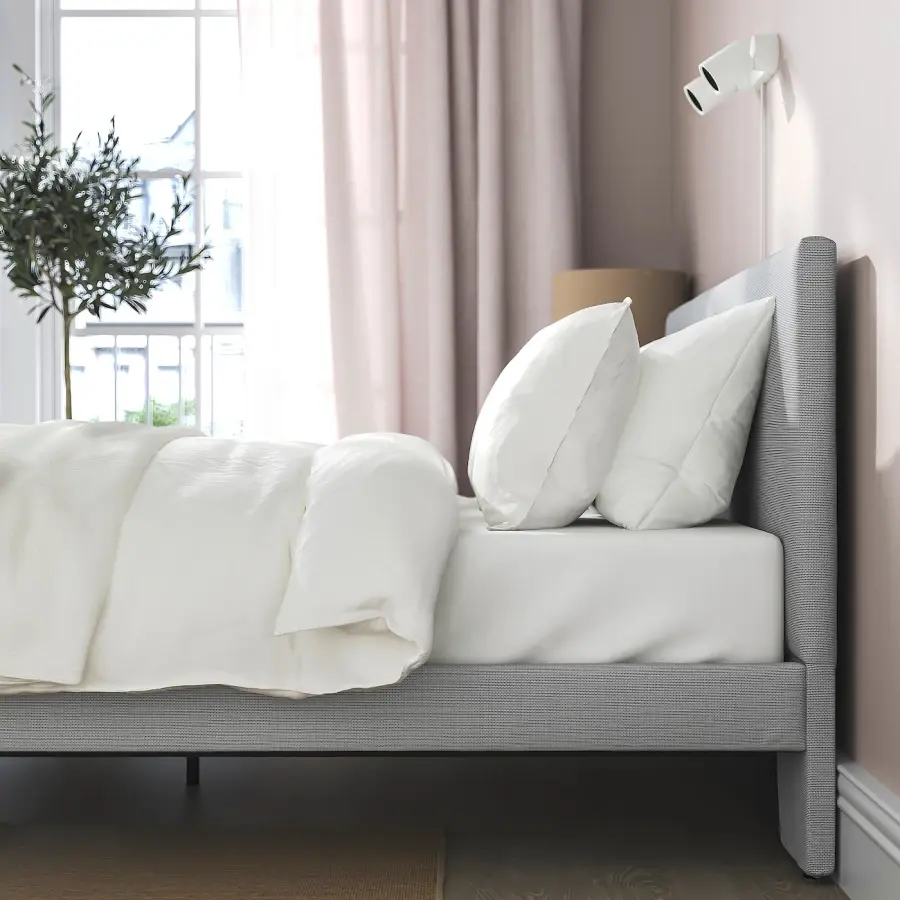 ИКЕА IKEA Каркас кровати с мягкой обивкой GLADSTAD — это современная классика с лаконичным и лаконичным дизайном. Мягкое изголовье служит удобной спинкой, например, при чтении или завтраке на выходных в постели. Мягкое покрывало KABUSA имеет легкую текстуру и соткано из нитей трех различных оттенков серого, которые скрывают легкие пятна. Простой и универсальный дизайн хорошо сочетается с другой мебелью для спальни и идеально вписывается в любую современную спальню. Под кроватью достаточно места для ящиков для хранения — отлично подходит для хранения дополнительных одеял и простыней. Оригинальная икея/ikea
