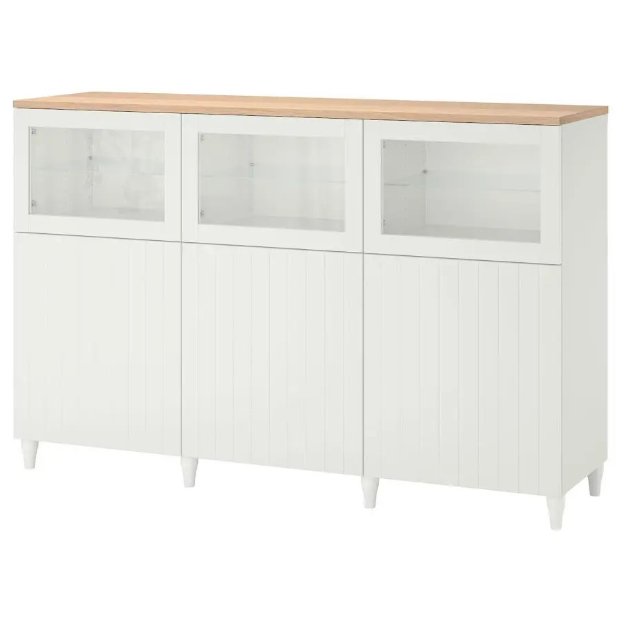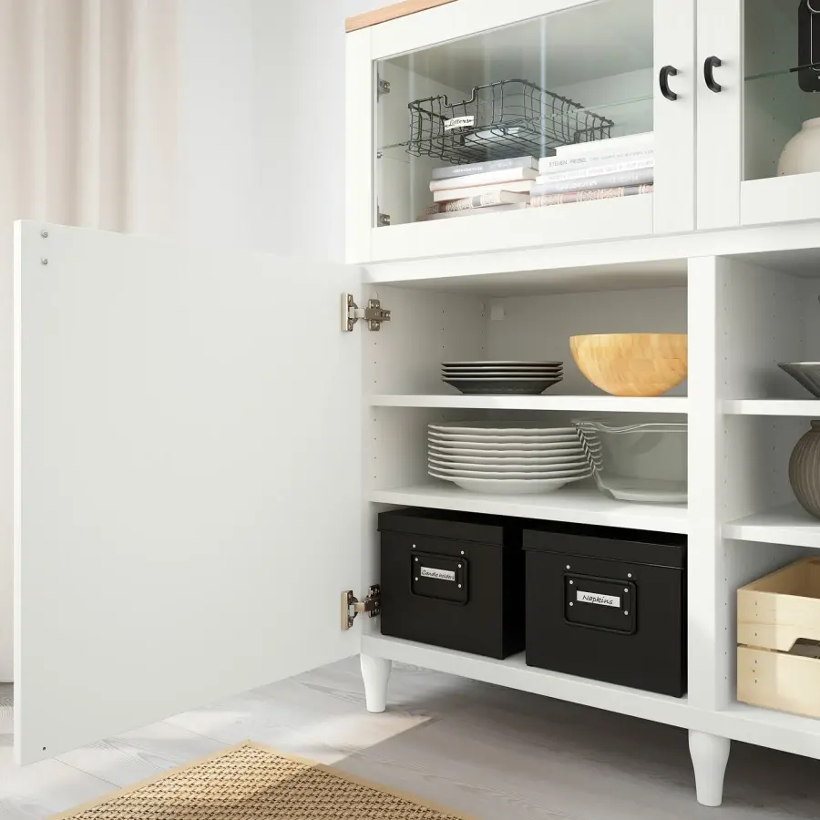 Вы можете использовать функцию плавного закрытия или открытия нажатием. Стеклянные двери защитят ваши лучшие вещи от пыли, но при этом сохранят видимость. Закаленное стекло более ударопрочно, чем обычное стекло. Высота мебели позволяет использовать верхнюю часть в качестве витрины, чтобы вы могли показать еще больше своих любимых вещей. Полки регулируются, поэтому вы можете настроить пространство для хранения по мере необходимости. Ножки приподнимают вашу комбинацию БЕСТО от пола, придавая ей легкий воздушный вид и облегчая уборку пола под ней.