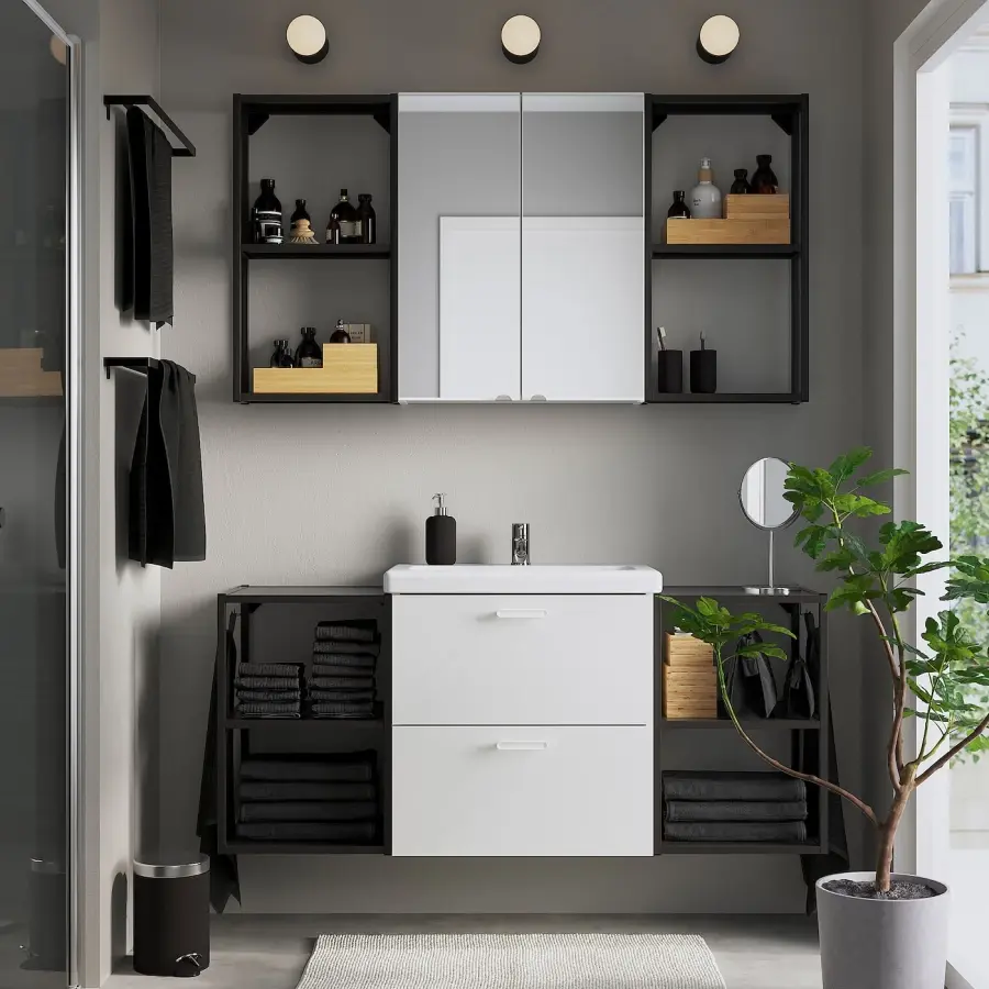 ИКЕА IKEA Такое решение с умывальником и зеркальным шкафом ставит вас в центр внимания, благодаря чему вы можете поработать над своим внешним видом, а по бокам в открытых шкафах достаточно места для необходимых вещей. Ты можешь это сделать! Оригинальная икея/ikea