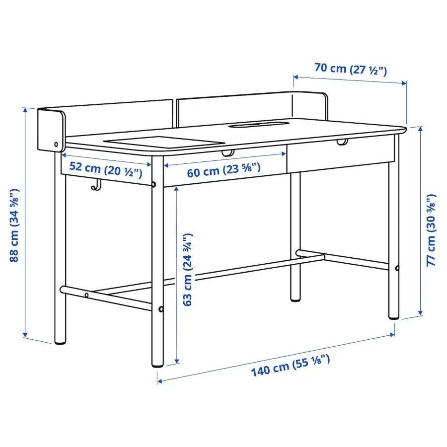 ИКЕА IKEA 2 вместительных ящика: в одном можно спрятать то, что вы не хотите видеть, и в другом можно отобразить то, что вы хотите видеть больше. Вы можете использовать ящик со стеклянной крышкой, чтобы делать пометки маркером, рисовать или просто демонстрировать в нем красивые вещи. Изогнутый экран создает ощущение личного пространства и делает стол красивым сзади. Экран имеет узкое отверстие, через которое можно вывести кабели сзади. Управление кабелями с крышкой, чтобы вы могли спрятать кабели на столе и получить удобное рабочее место без кабелей. Крючок можно разместить слева или справа от стола, чтобы повесить сумку или наушники. Вы сидите удобно, так как кресло регулируется по высоте. Формованная высокоэластичная пена обеспечивает комфорт на долгие годы. Оригинальная икея/ikea