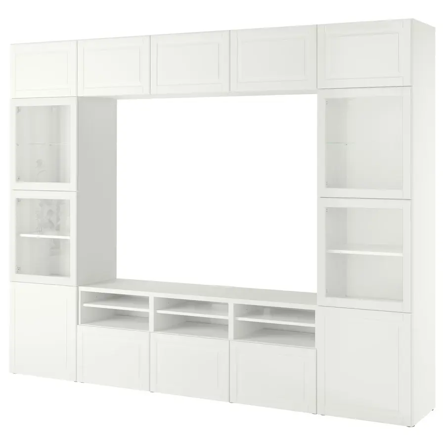 ИКЕА IKEA Кабели от телевизора и других устройств легко хранить вне поля зрения, но под рукой, так как в задней части тумбы для телевизора есть несколько выходов для кабелей. Выход для кабеля в верхней части позволяет кабелям плавно спускаться в тумбу под телевизор. Полки за дверцами дают вам еще больше места для хранения. Оптимизируйте и организуйте свое хранилище БЕСТО с помощью ящиков и вставок, которые вам нравятся. Полки регулируются, поэтому вы можете настроить свое хранилище по мере необходимости. Компактные навесные шкафы максимально эффективно используют пространство на стене над телевизором. Оригинальная икея/ikea