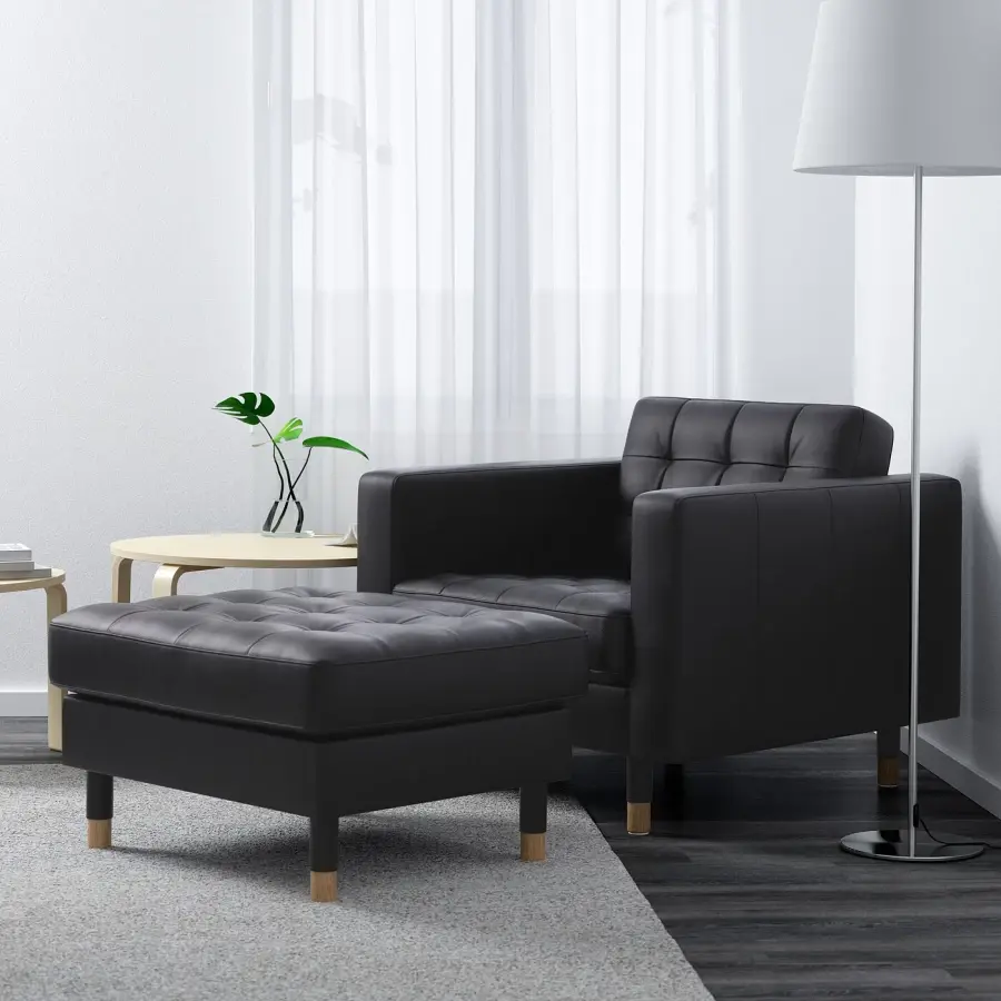 ИКЕА IKEA Подушки сидений, наполненные высокоэластичной пеной и набивкой из полиэфирного волокна, обеспечивают отличный комфорт при сидении. Гарантия 10 лет. Об условиях читайте в гарантийном буклете. Контактные поверхности покрыты GRANN – мягкой, гладкой и прочной кожей с натуральными вариациями. Другие поверхности имеют BOMSTAD, ткань с покрытием, похожую на кожу. Оригинальная икея/ikea
