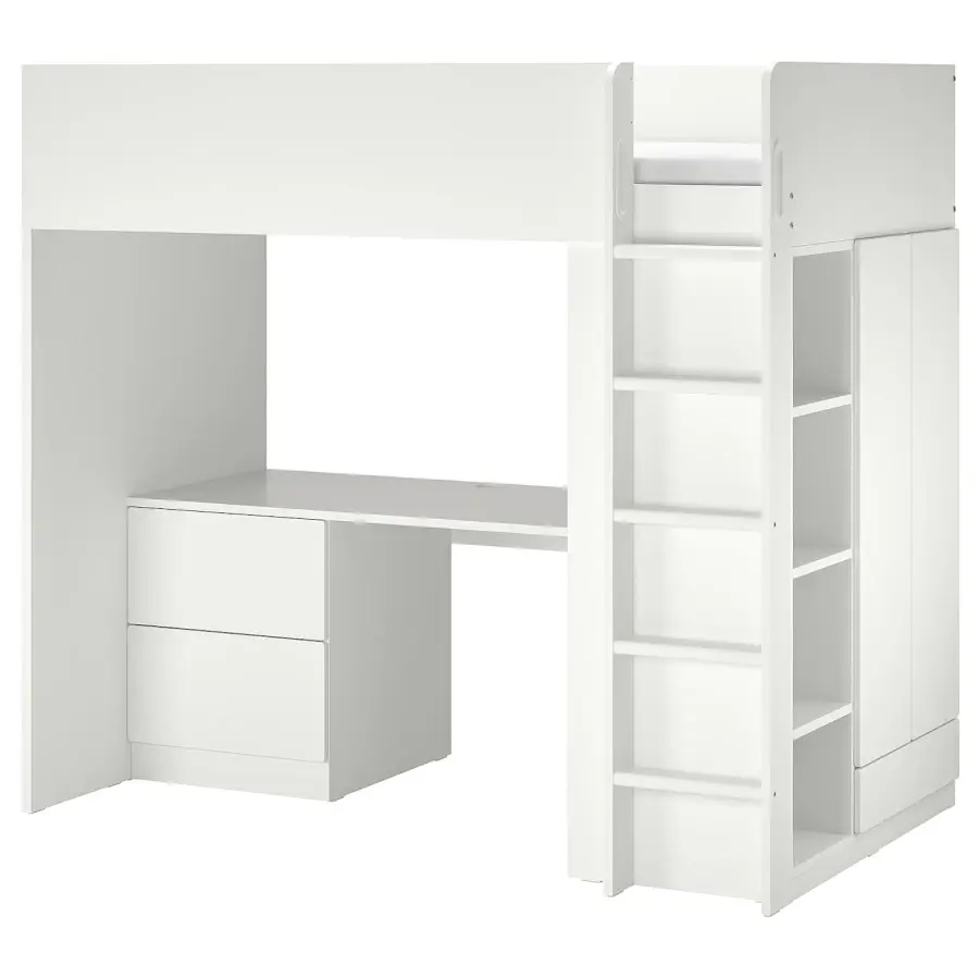 ИКЕА IKEA Иметь собственное пространство очень важно в детстве. Эта комбинация является идеальным решением, если вы живете в небольших помещениях или делите комнаты с братьями и сестрами. Компактная комбинация включает в себя кровать-чердак, письменный стол с выдвижными ящиками, платяной шкаф с выдвижным ящиком и книжный шкаф. Лестница крепится справа или слева от кровати. Стол можно установить параллельно или перпендикулярно кровати. Гардероб также можно расположить в разных направлениях. Оригинальная икея/ikea