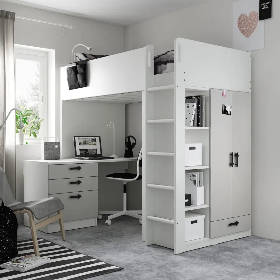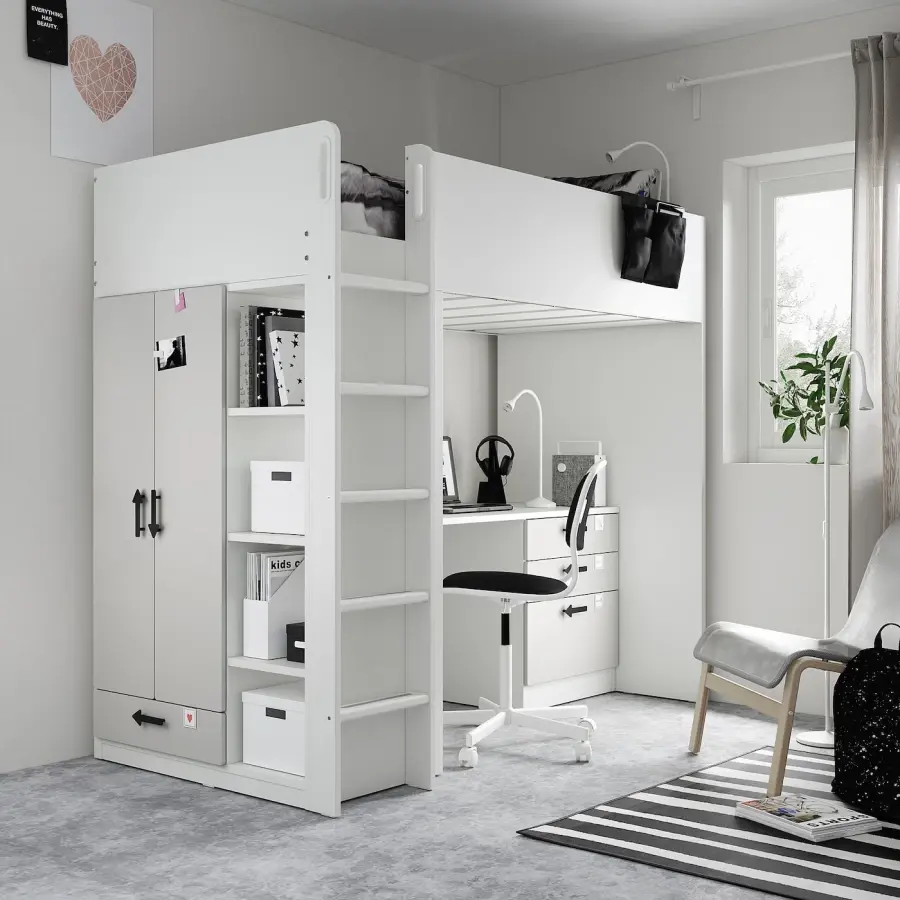 Когда вы взрослеете, важно иметь собственное пространство. Эта комбинация — просто спасение, когда вы живете в небольшом помещении или живете в одной комнате с братьями и сестрами. Компактное сочетание включает в себя кровать-чердак, письменный стол с выдвижными ящиками, шкаф с выдвижным ящиком и книжный шкаф. Лестница крепится справа или слева от кровати. Стол можно установить параллельно или перпендикулярно кровати. Шкаф также можно разместить в разных направлениях.