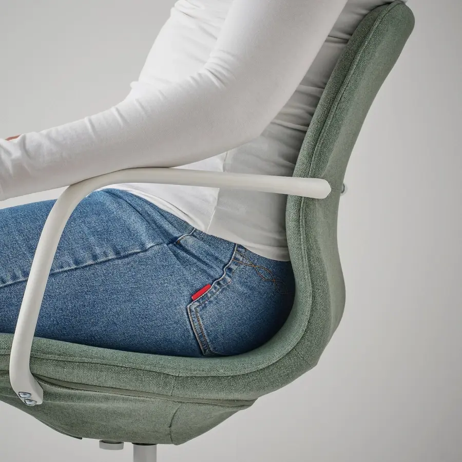 ИКЕА IKEA Гарантия 10 лет. Прочтите об условиях в гарантийной брошюре. Подходит для использования в бизнесе. Регулируемое по высоте сиденье позволяет регулировать высоту так, чтобы спина и ноги находились под углом 90°. Поясничная поддержка помогает поддерживать правильную осанку во время сидения, что снижает нагрузку на мышцы нижней части спины. Повышенная устойчивость, поскольку функция наклона блокируется, когда спинка находится в вертикальном положении. Вы можете откинуться назад, сохраняя идеальный баланс, поскольку механизм натяжения наклона легко отрегулировать с помощью шестигранного ключа в соответствии с вашим весом и движениями. Подлокотники обеспечивают поддержку верхней части предплечий и снижают нагрузку на спину и плечи во время длительных совещаний. Доступен в нескольких различных цветах для создания свежего нового образа. Расслабляющие цвета, вдохновленные природой, могут улучшить самочувствие и помочь нам сосредоточиться на работе. Цвета идеально сочетаются с офисными стульями HATTEFJÄLL и конференц-стульями LÄKTARE, создавая гармоничный образ в конференц-залах и рабочих зонах. Безопасные ролики оснащены чувствительным к давлению тормозным механизмом, который удерживает кресло на месте, когда вы встаете, и автоматически освобождается, когда вы садитесь. Оригинальная икея/ikea
