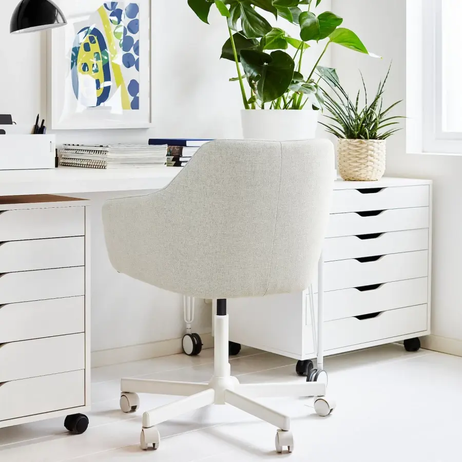 Сиденье изготовлено из высокоэластичного пеноматериала, который сохраняет свою форму и имеет структуру, позволяющую воздуху циркулировать, обеспечивая удобную поверхность для сидения. Вы сидите комфортно, поскольку кресло регулируется по высоте. Безопасные ролики оснащены чувствительным к давлению тормозным механизмом, который удерживает кресло на месте, когда вы встаете, и автоматически освобождается, когда вы садитесь. Высокая спинка и изогнутая форма стула обеспечивают хорошую поддержку поясницы и предотвращают усталость спины. Вы сидите удобно, дольше и в расслабленной позе. Это вращающееся кресло хорошо подходит для всех типов помещений и обеспечивает удобное сидение, независимо от того, делаете ли вы домашнее задание, занимаетесь хобби или просто оплачиваете счета. Прекрасно сочетается с обеденными стульями ТОССБЕРГ.