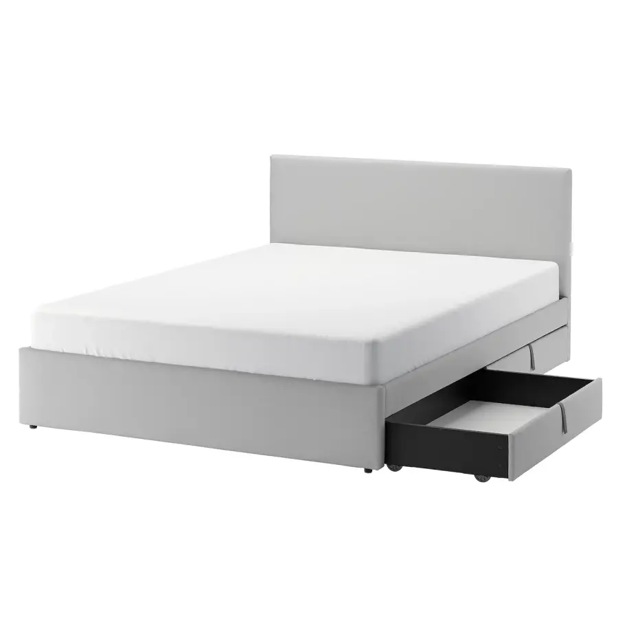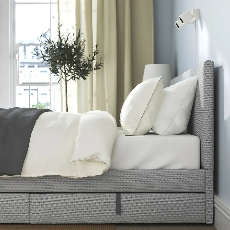 ИКЕА IKEA Этот каркас кровати с мягкой обивкой и 4 ящиками для хранения с мягкой обивкой дает вам как удобное место для отдыха и сна, так и практичное место для хранения под кроватью. Ящики для хранения кровати имеют такое же серое покрытие KABUSA, что и каркас кровати, и идеально подходят под кровать. Ящики для хранения легко выдвигаются и вставляются благодаря колесикам на основании. Вы можете спрятать ручки, чтобы придать изящество, или выставить их напоказ как элемент дизайна. Мягкое изголовье служит удобной спинкой, например, когда вы читаете или наслаждаетесь завтраком на выходных в постели. Мягкое покрывало KABUSA имеет легкую текстуру и соткано из нитей трех различных оттенков серого, которые скрывают светлые пятна. Простой и универсальный дизайн хорошо сочетается с другой мебелью для спальни и идеально вписывается в любую современную спальню. Оригинальная икея/ikea