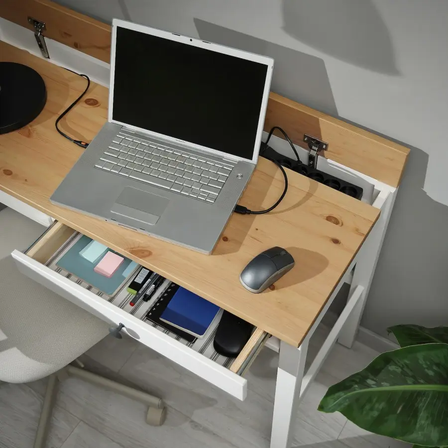 ИКЕА IKEA Может быть размещен в середине комнаты, потому что задняя часть закончена. Встроенный кабель-менеджмент; Держит кабели вне поля зрения, но под рукой. Массив дерева — прочный натуральный материал. В 2 ящиках можно хранить мелкие вещи, которые хочется спрятать, но при этом иметь под рукой. Оригинальная икея/ikea