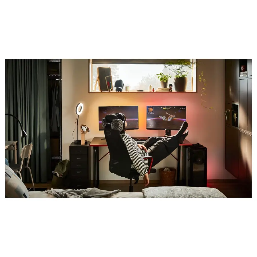 ИКЕА IKEA 3 года гарантии. Об условиях читайте в гарантийном буклете. Играть должно быть комфортно, особенно когда матч затягивается. Вот почему столешница такая глубокая, что позволяет расположить экраны на удобном расстоянии от глаз. Прочная поверхность стола приятна для глаз, так как отражение света низкое. Стол легко содержать в чистоте и порядке, используя кабельный канал под столешницей. Наушники всегда могут быть под рукой благодаря входящему в комплект крючку. Большая столешница вмещает два 24-дюймовых экрана. Идеально совпадает. Оригинальная икея/ikea