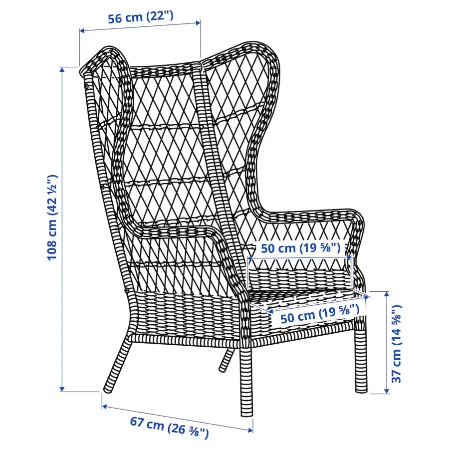ИКЕА IKEA Плетеный вручную пластиковый ротанг выглядит как натуральный ротанг, но более прочен для использования на открытом воздухе. Здесь вы можете расслабиться и наслаждаться, поскольку высокая спинка кресла с крыльями обнимает вас и создает ощущение кокона, обеспечивая удобную поддержку вашей головы и шеи. Прочный, атмосферостойкий и не требующий обслуживания, поскольку мебель изготовлена из пластикового ротанга и нержавеющего алюминия. Ручная работа квалифицированных мастеров, что делает каждый продукт уникальным. Оригинальная икея/ikea