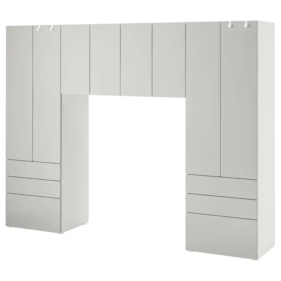 Идеально подходит там, где пространство ограничено, поскольку рама узкая. Двери оснащены петлями с плавным закрыванием, которые позволяют им закрываться мягко и бесшумно даже после ожесточенного спора. Чтобы и вы, и ваш ребенок избегали острых краев, все углы дверей СМОСТАД мягко закруглены. Устойчиво стоит даже на неровном полу, поскольку в комплект входят регулируемые ножки. Продуманная конструкция направляющих позволяет ящику слегка втягиваться при отпускании – для экономии места. Регулируемая штанга для одежды позволяет легко настроить решение в соответствии с вашими потребностями. Внутри вы можете организовать интерьер с помощью серии HJÄLPA, а для экстерьера есть умные решения серии LÄTTHET.