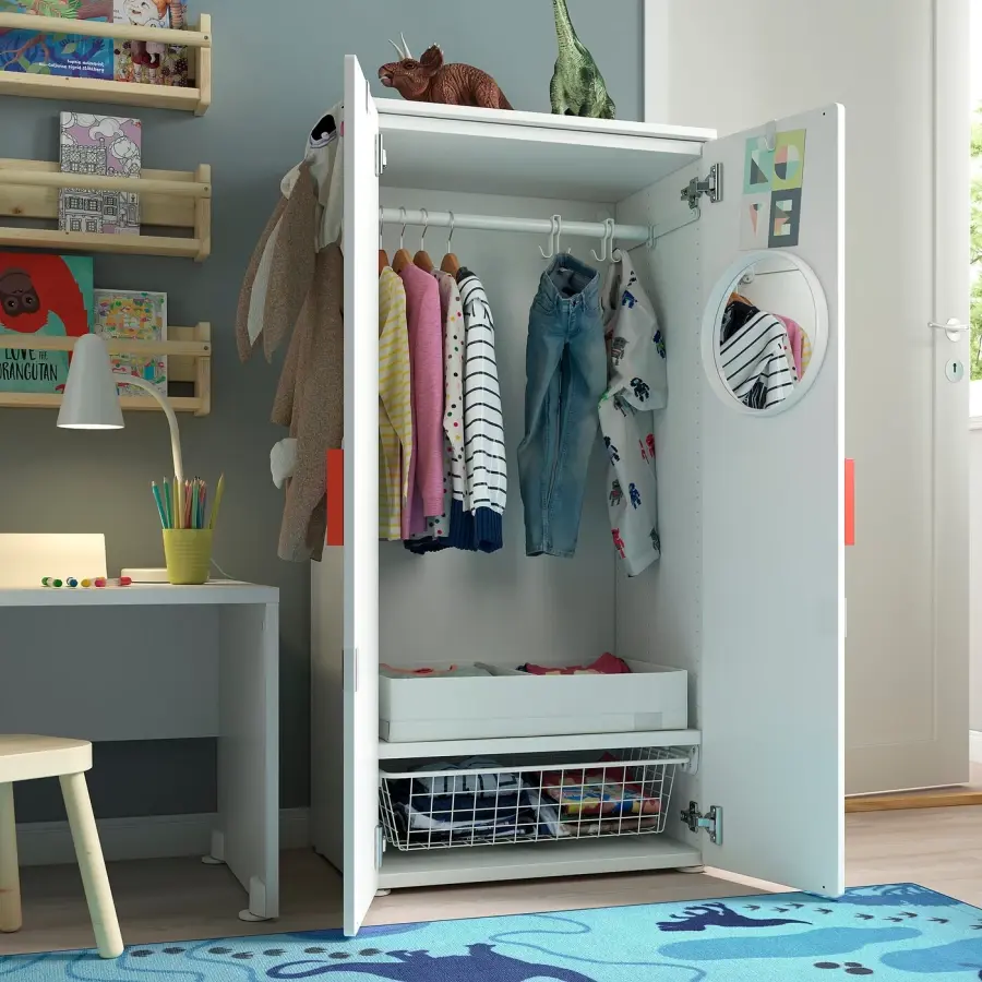 Этот шкаф адаптирован к росту и моторике ребенка младшего возраста, чтобы он мог самостоятельно дотянуться и повесить одежду. Шкаф имеет внутреннюю часть, которую вы можете перемещать и регулировать в соответствии с потребностями вашего ребенка. Двери оснащены петлями с плавным закрыванием, которые позволяют им закрываться мягко и бесшумно даже после ожесточенного спора. Устойчиво стоит даже на неровном полу, поскольку в комплект входят регулируемые ножки.