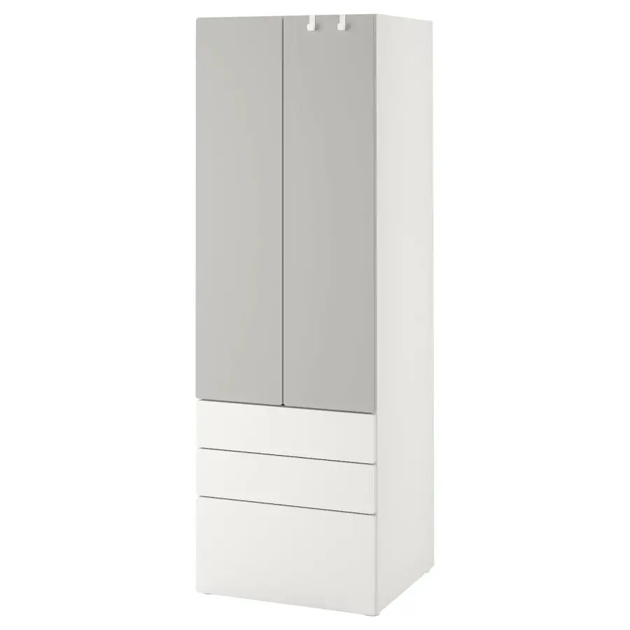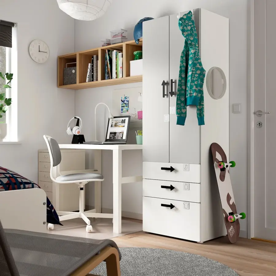 Этот шкаф дает вам много места для хранения вещей на небольшой площади. Идеально подходит там, где пространство ограничено, поскольку рама узкая. Чтобы и вы, и ваш ребенок избегали острых краев, все углы дверей СМОСТАД мягко закруглены. Двери оснащены петлями с плавным закрыванием, которые позволяют им закрываться мягко и бесшумно даже после ожесточенного спора. Продуманная конструкция направляющих позволяет ящику слегка втягиваться при отпускании – для экономии места. Благодаря крючкам на вешалке для одежды очень велика вероятность того, что одежда, рюкзаки и аксессуары вернутся обратно в гардероб, а не окажутся на полу. Внутри вы можете организовать интерьер с помощью серии ХЬЭЛПА, а для экстерьера есть умные решения серии ЛЭТТХЕТ. Регулируемые ножки позволяют компенсировать неровности пола.