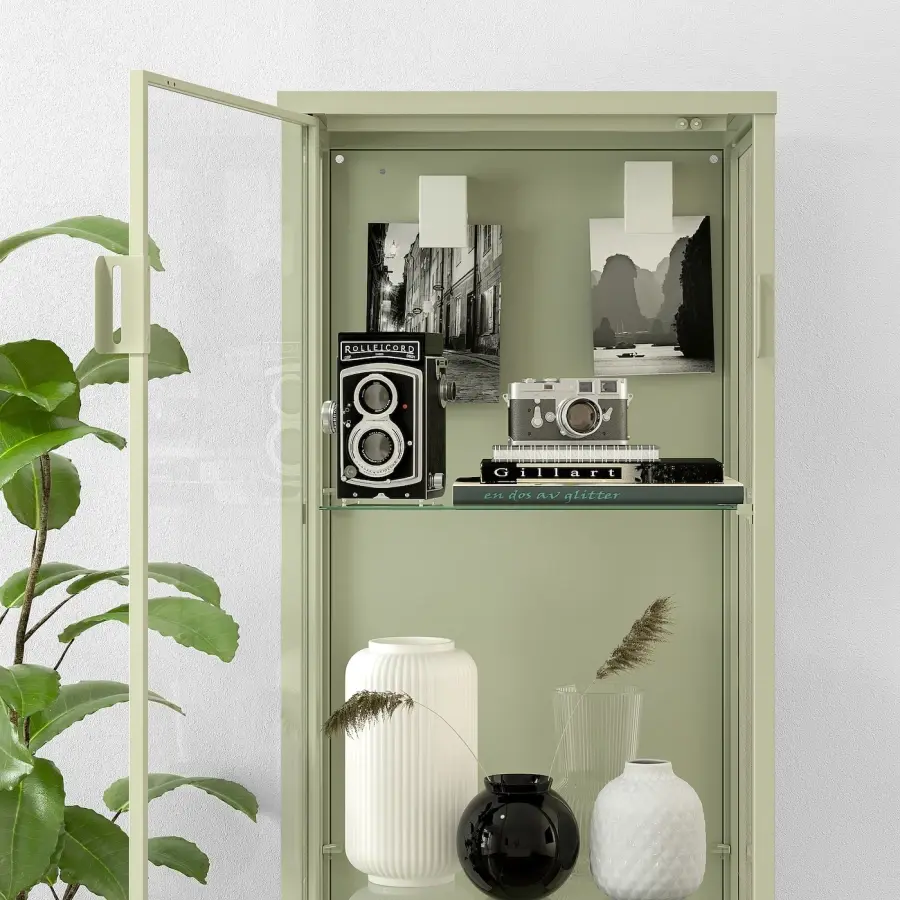 Наслаждайтесь личным кабинетом воспоминаний – разместите на полках самые любимые вещи и с помощью магнитов прикрепите к задней панели шкафа фотографии, рисунки и другие заветные вещи. Вы можете легко дополнить свой шкаф со стеклянной дверью встроенным освещением, поскольку он подготовлен для прокладки кабелей. Шкаф можно запереть стандартным навесным замком, чтобы вы могли надежно хранить свои вещи. Вы можете прикрепить магниты к металлической поверхности и использовать ее как доску для булавок. Устойчив даже на неровном полу благодаря регулируемым ножкам.