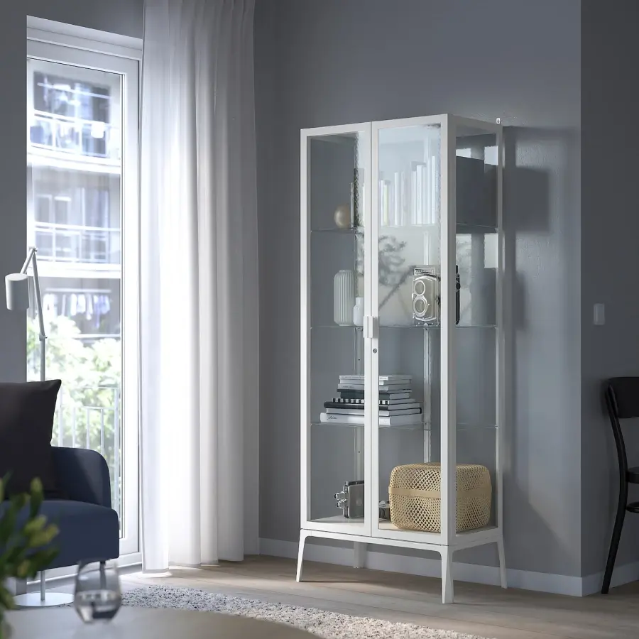 ИКЕА IKEA В шкафу со стеклянной дверью вы можете не только хвастаться, но и защищать свою стеклянную посуду или любимую коллекцию. Стеклянные полки регулируются, чтобы вы могли настроить пространство для хранения в соответствии с потребностями. Входящий в комплект замок позволяет хранить ваши вещи безопасным способом, так что вы и ваши маленькие дети будете в безопасности. Вы можете легко дополнить шкаф со стеклянной дверью встроенным освещением благодаря выходу для кабеля в верхней части. Оригинальная икея/ikea
