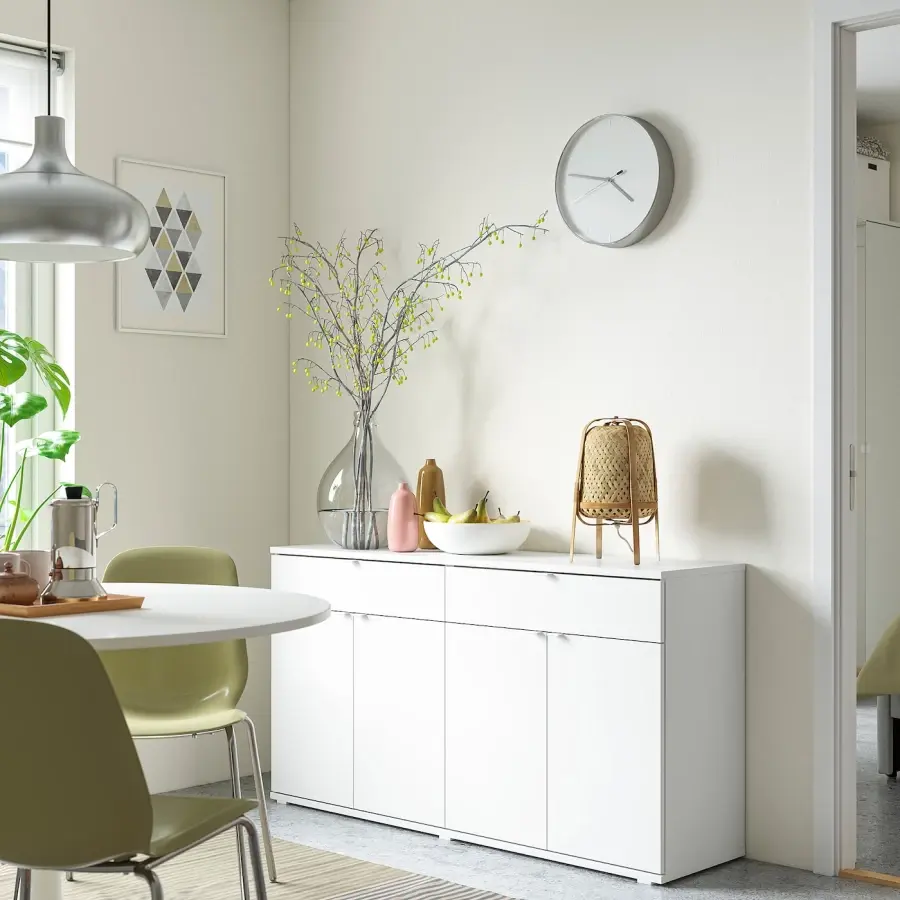 ИКЕА IKEA Используйте по всему дому, отдельно или с другой мебелью VIHALS. Глубина 37 см означает, что буфет легко поместится даже в ограниченном пространстве, например, в прихожей или небольшой обеденной зоне. Разместите свои любимые предметы в верхней части буфета и спрячьте предметы, которые имеют тенденцию загромождать ящики или за дверьми. Выдвижные ящики и место в шкафу позволяют разместить как маленькие, так и большие предметы. Полки за дверьми дают вам еще больше места для хранения. 1 регулируемая полка за каждой дверью. Каркас легче собрать благодаря продуманной конструкции с клиновидными дюбелями, которые удобно вдавливаются в предварительно просверленные отверстия. Большинство материалов, используемых в VIHALS, поступают из возобновляемых источников. Оригинальная икея/ikea