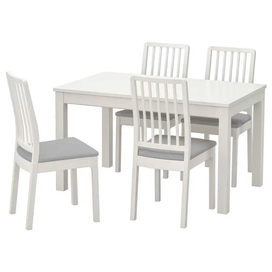 ИКЕА IKEA Обеденный стол привнесет в ваше обеденное пространство ощущение природы. Оттенки деревенской белой отделки позволяют сиять красоте древесных волокон. Размер стола можно быстро и легко изменить в соответствии с вашими потребностями. С дополнительной створкой, хранящейся под столешницей, вы можете расширить стол, чтобы вместить от 4 до 6 человек. Один человек может быстро и плавно раздвинуть стол перед приходом гостей. Каркас из цельного дерева делает конструкцию очень прочной. Поверхность стола устойчива к жидкостям, пищевым пятнам, маслам, теплу, царапинам и ударам. Мягкое сиденье и удобный угол наклона спинки делают стул идеальным для продолжительных обедов. Чехол легко снимается, стирается в машине и снова надевается. Оригинальная икея/ikea