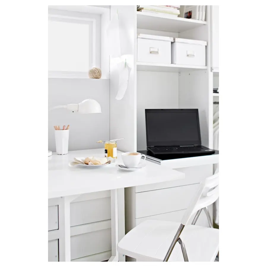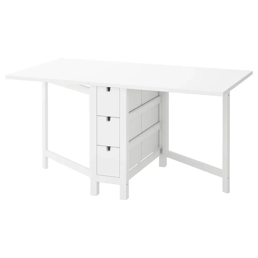 ИКЕА IKEA Небольшие аккуратные размеры позволяют легко обставить стол даже в условиях ограниченного пространства. Стол с откидными створками рассчитан на 2-4 человека; позволяет регулировать размер стола в соответствии с потребностями. Например, столовые приборы, столовые салфетки и свечи можно хранить в 6 ящиках под столешницей. Оригинальная икея/ikea