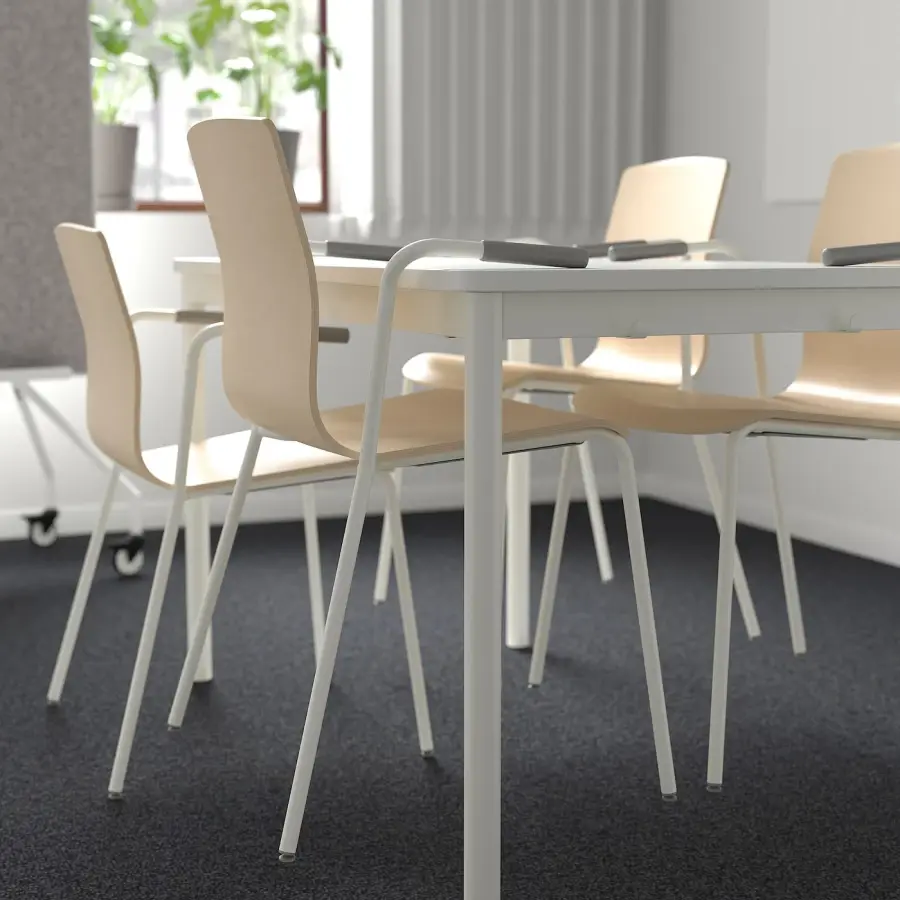 ИКЕА IKEA 10 лет гарантии. Ознакомьтесь с условиями в гарантийной брошюре. Подходит для использования в бизнесе. Поясничная опора помогает поддерживать правильную осанку во время сидения, что снижает нагрузку на мышцы нижней части спины. Подлокотники обеспечивают поддержку верхней части предплечий и снижают нагрузку на спину и плечи во время длительных встреч. Резиновые подлокотники удерживают кресло на месте, когда вы подвешиваете его над столешницей, чтобы облегчить уборку полов. Более темный цвет скрывает загрязнения, возникающие в результате частого использования. Легкий и простой в перемещении или перестановке в соответствии с потребностями ваших встреч. Экономьте место, когда стулья не используются. Штабелируйте до 5 стульев с тканевой обивкой или до 7 стульев без обивки. Мягкая пластина под сиденьем стула предотвращает появление царапин на поверхности сиденья, когда стулья ставятся друг на друга. Более короткие подлокотники позволяют сидеть ближе к столу для лучшей осанки. Кроме того, вам не нужно выдвигать его так далеко, когда вы встаете со стула. Резиновые ножки кресла защищают пол и уменьшают шум от движущихся кресел. Создайте цветной офис. Используйте чехлы на стулья разных цветов для разных зон для встреч и работы. Кресло для совещаний ЛЕКТАРЕ идеально сочетается с креслом для совещаний ЛОНГФЬЕЛЛЬ и офисным креслом ХАТТЕФЬЕЛЛЬ. Оригинальная икея/ikea