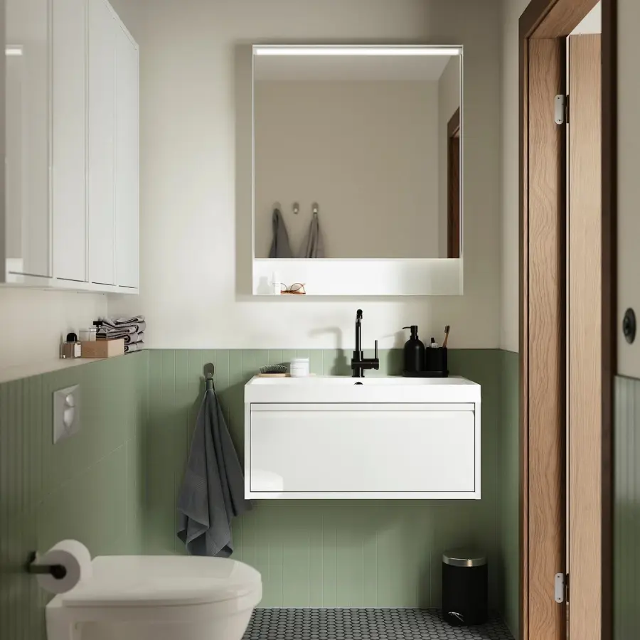 ИКЕА IKEA Современный характер мебели для ванной комнаты серии ЭНГСЁН подчеркнут встроенными ручками и изысканным минимализмом. Шкаф с выдвижным ящиком спроектирован таким образом, что его можно комбинировать как со столешницей, так и с умывальником. Оригинальная икея/ikea