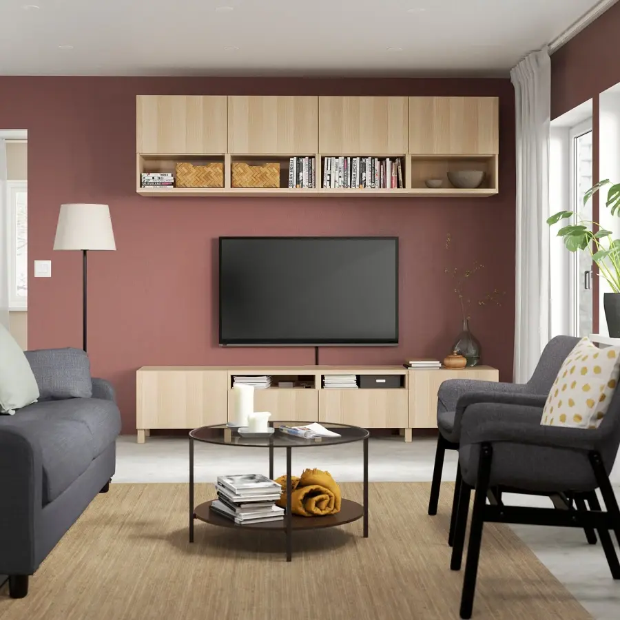 ИКЕА IKEA Кабели от телевизора и других устройств легко хранить вне поля зрения, но под рукой, так как в задней части тумбы для телевизора есть несколько выходов для кабелей. Выход для кабеля наверху позволяет кабелям плавно спускаться в тумбу под телевизор. Полки за дверцами дают вам еще больше места для хранения. Ножки приподнимают вашу комбинацию БЕСТО от пола, придавая ей легкий воздушный вид и облегчая уборку пола под ней. Полки регулируются, поэтому вы можете настроить пространство для хранения по мере необходимости. Оригинальная икея/ikea