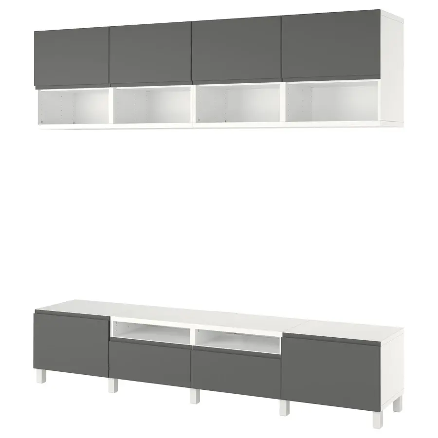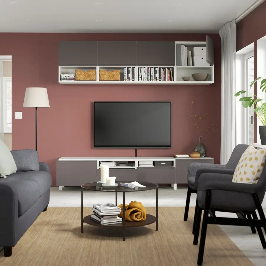 ИКЕА IKEA Фронтальная часть VÄSTERVIKEN имеет встроенную ручку, которая придает современный вид чистым линиям. Кабели от телевизора и других устройств легко держать вне поля зрения, но под рукой, так как в задней части тумбы для телевизора есть несколько выходов для кабелей. Выход для кабеля в верхней части позволяет кабелям плавно спускаться в тумбу под телевизор. Полки за дверцами дают вам еще больше места для хранения. Ножки приподнимают вашу комбинацию БЕСТО от пола, придавая ей легкий воздушный вид и облегчая уборку пола под ней. Полки регулируются, поэтому вы можете настроить свое хранилище по мере необходимости. Оригинальная икея/ikea