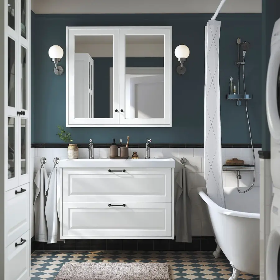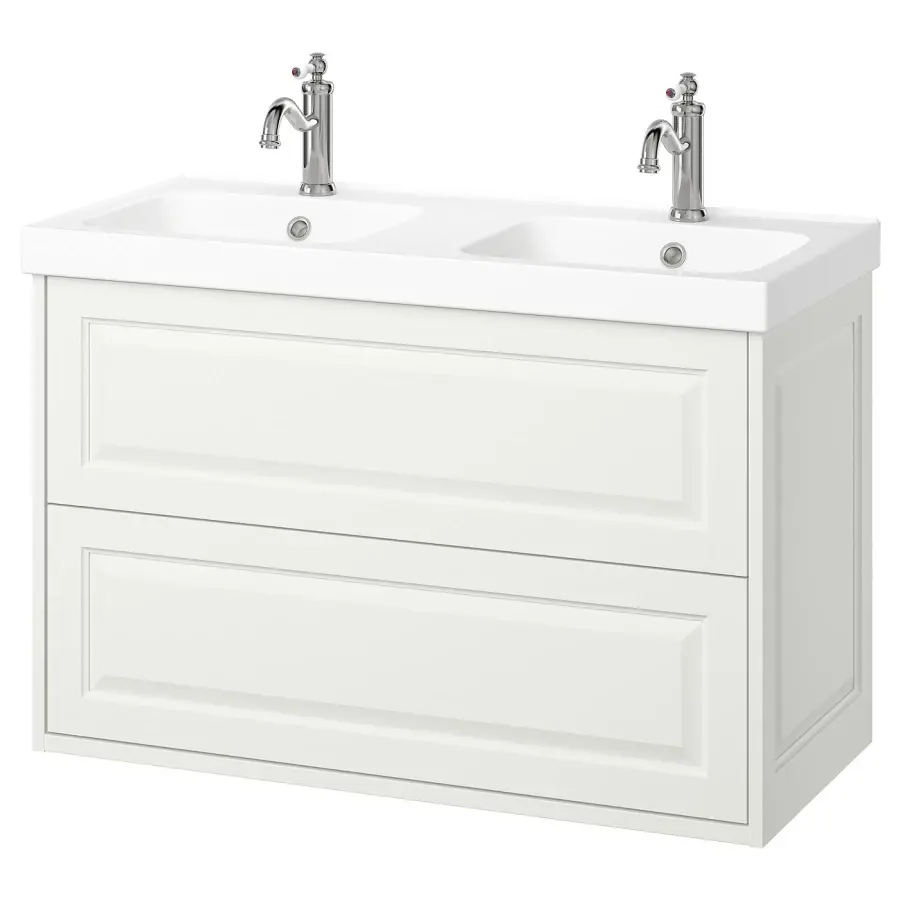 ИКЕА IKEA Мебель для ванной комнаты ТЭННФОРСЕН излучает классическую элегантность благодаря своим скошенным краям, которые придают ей вид ручной работы. В эту комбинацию входят 2 вместительных ящика и двойная раковина, которая легко справится с утренней суетой. Оригинальная икея/ikea