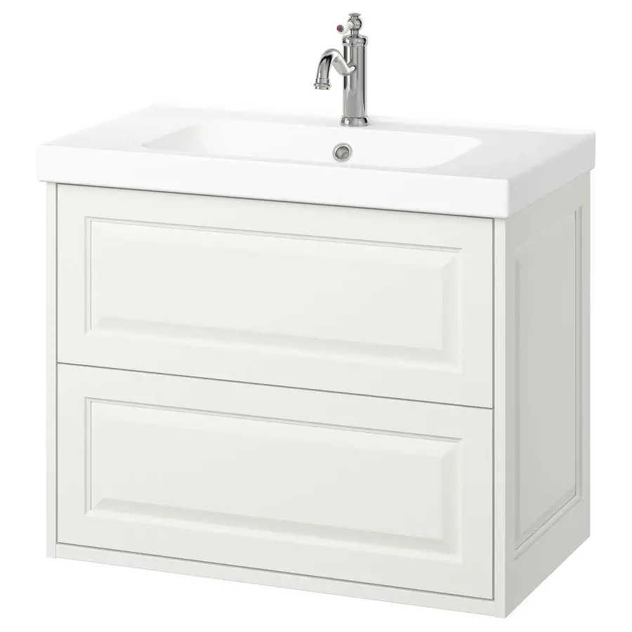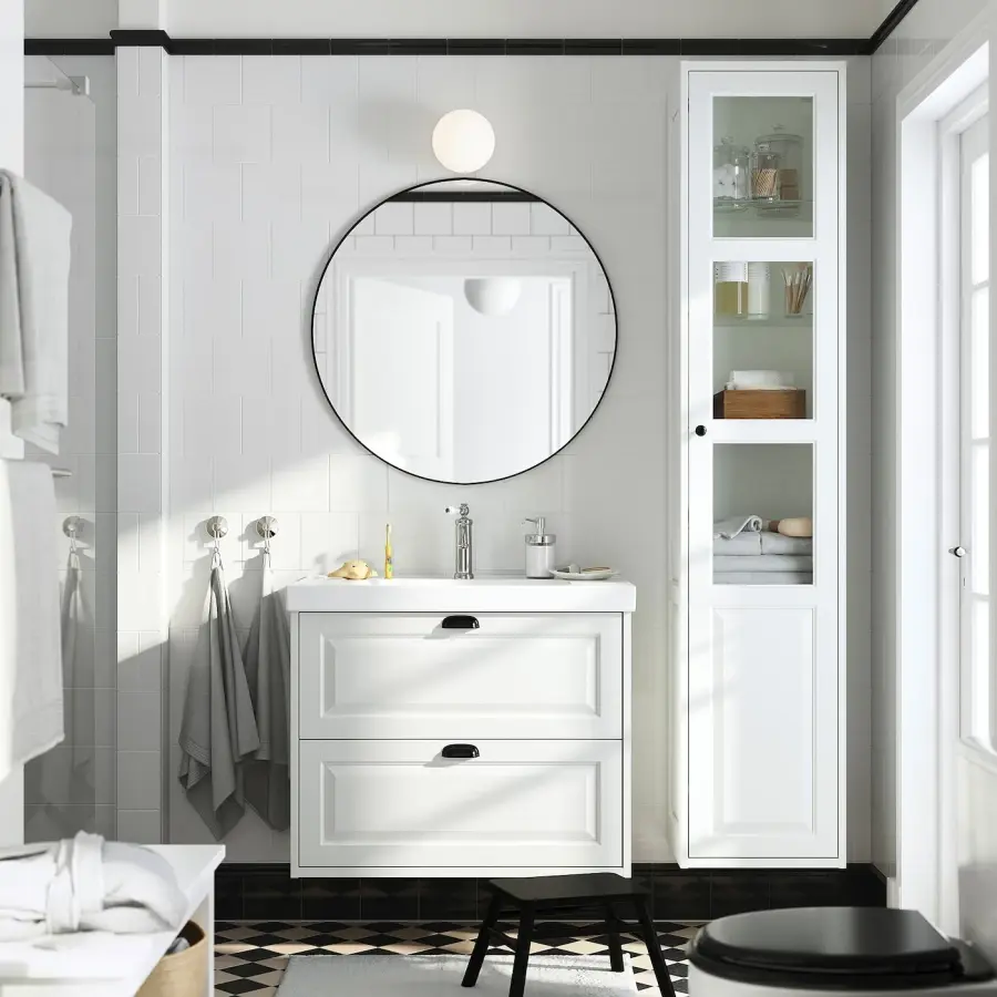 ИКЕА IKEA Мебель для ванной комнаты ТЭННФОРСЕН излучает классическую элегантность благодаря своим скошенным краям, которые придают ей вид ручной работы. Комбинация с 2 просторными ящиками и большим количеством места на раковине, которое можно использовать для зубных щеток и мыла. Оригинальная икея/ikea