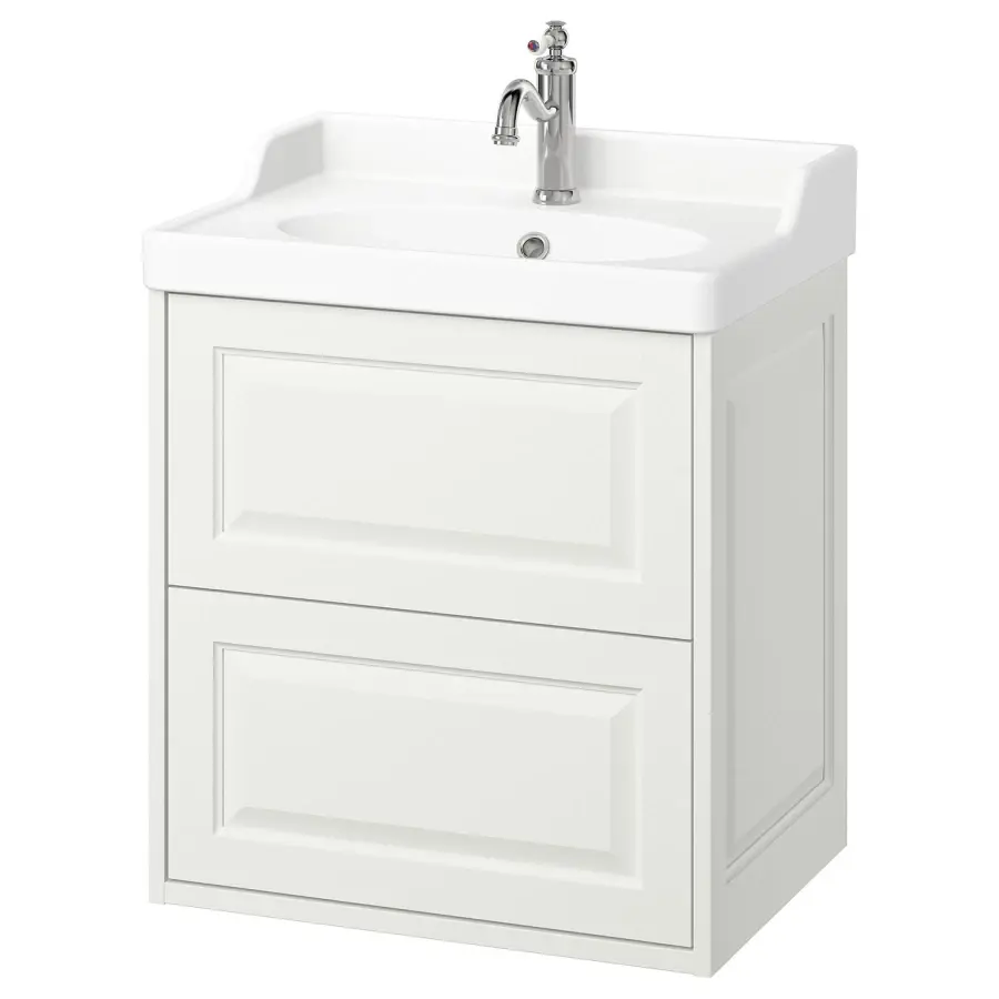 ИКЕА IKEA Мебель для ванной комнаты ТЭННФОРСЕН излучает классическую элегантность благодаря своим скошенным краям, которые придают ей вид ручной работы. Сочетание двух вместительных ящиков и умывальника с приподнятым бортиком впечатляет традиционным дизайном. Оригинальная икея/ikea