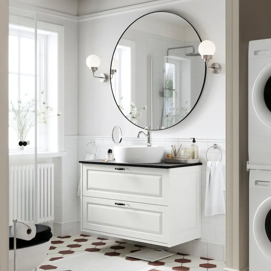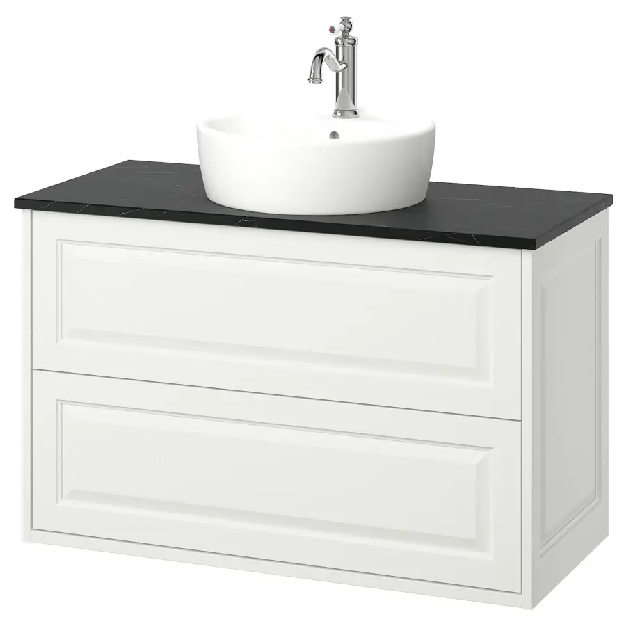 ИКЕА IKEA Мебель для ванной комнаты TÄNNFORSEN со скошенными краями излучает классическую элегантность. Шкаф под умывальник в сочетании со столешницей и круглой раковиной на столешнице создают уникальный декоративный элемент, напоминающий о прекрасном мастерстве. Оригинальная икея/ikea