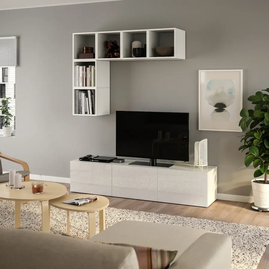 ИКЕА IKEA Настенная тумба под телевизор создает чистый, воздушный вид, и у нее нет ножек, которые мешают, когда вы пылесосите пол. Кабели от телевизора и других устройств легко держать вне поля зрения, но под рукой, так как в задней части тумбы для телевизора есть несколько выходов для кабелей. Нажимная кнопка позволяет открывать двери легким нажатием, а плавно закрывающиеся петли гарантируют, что они закрываются бесшумно и мягко. Оптимизируйте и организуйте свое хранилище БЕСТО с помощью ящиков и вставок, которые вам нравятся. Оригинальная икея/ikea