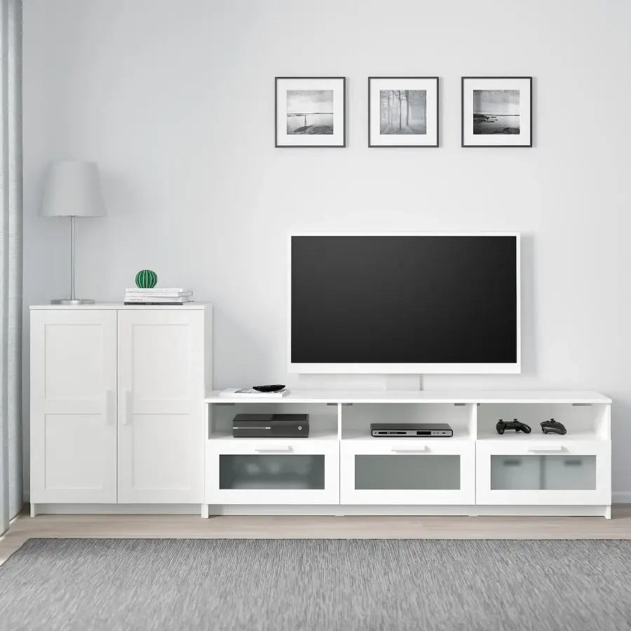 ИКЕА IKEA Эта тумба для телевизора имеет большие ящики, в которых легко хранить пульты дистанционного управления, игровые контроллеры и другие аксессуары для телевизора. Регулируемые полки, так что вы можете настроить пространство для хранения по мере необходимости. Кабельные розетки облегчают вывод кабелей сзади, поэтому они скрыты от глаз, но всегда под рукой, когда они вам нужны. Со стеклянной дверью шкафа вы можете хвастаться, а также защищать свою стеклянную посуду или свою любимую коллекцию. комната. Оригинальная икея/ikea