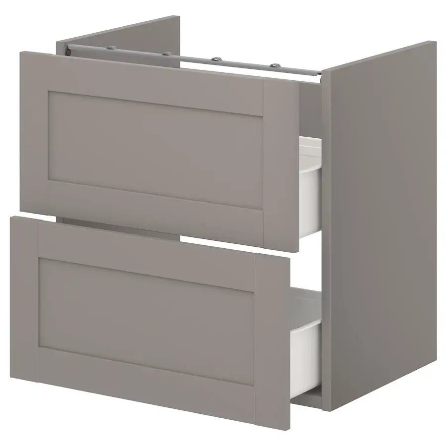 ИКЕА IKEA Вы можете хранить часто используемые вещи, такие как ватные диски, щетки и средства гигиены, в верхнем ящике, а другие вещи, такие как полотенца, в нижнем ящике. Много места для хранения и идеально подходит для небольших ванных комнат, поскольку ширина основания шкафа составляет всего 60 см. Серые фасады ENHET с рамой сочетаются со всем и создают ощущение тепла и уюта. Идеальный выбор, если вы хотите сдержанный цвет в качестве основы. Современный или классический стиль – выбор за вами. Уникальные клиновидные дюбели облегчают сборку, а фурнитура практически незаметна. Гарантия 10 лет. Ознакомьтесь с условиями в гарантийной брошюре. Оригинальная икея/ikea