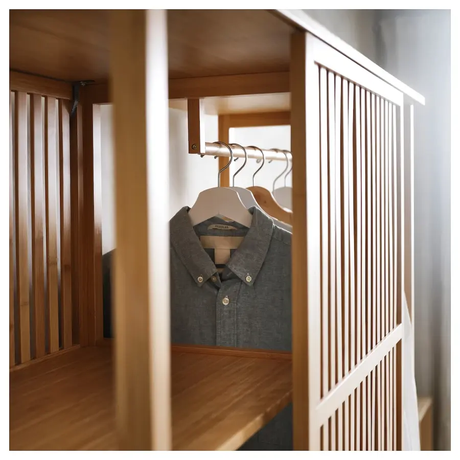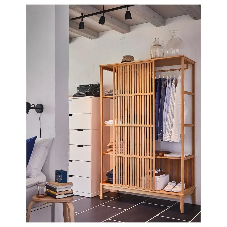 ИКЕА IKEA Вы можете создать перегородку, прикрепив одну из более коротких сторон шкафа к стене. Этот шкаф открытый, но создает уединение благодаря неподвижной стене с одной стороны и раздвижной двери с другой. Сдвиньте дверцу, чтобы получить доступ к висящей одежде с любой стороны шкафа. Сдвиньте дверь на другую сторону, чтобы получить доступ к своим вещам на полках. Почему бы не использовать полки для демонстрации ваших любимых предметов? Серия NORDKISA из бамбука прекрасно сочетается с сериями хранения NORDLI и ELVARLI. Оригинальная икея/ikea